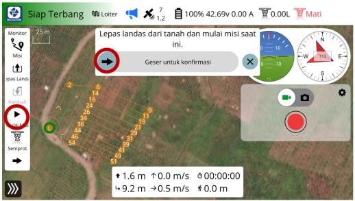 - Klik “Mulai Misi” pada halaman Monitor, geser “Slider” untuk mengonfirmasi lepas landas dan memulai misi. Setelah itu drone akan segera lepas landas dan mulai melakukan penyemprotan sesuai dengan misi yang telah dibuat.
